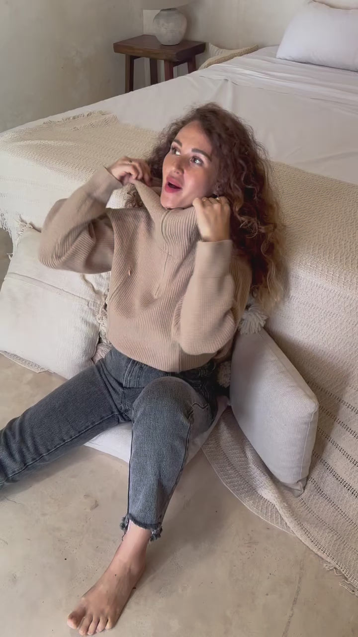 Une fois bien installée, identifiez les fermetures éclair discrètes situées sur les côtés du pull. Ces zips sont conçus pour offrir un accès rapide et facile aux seins.